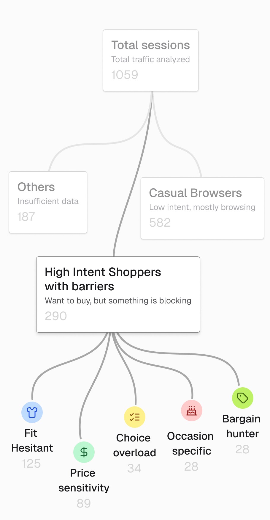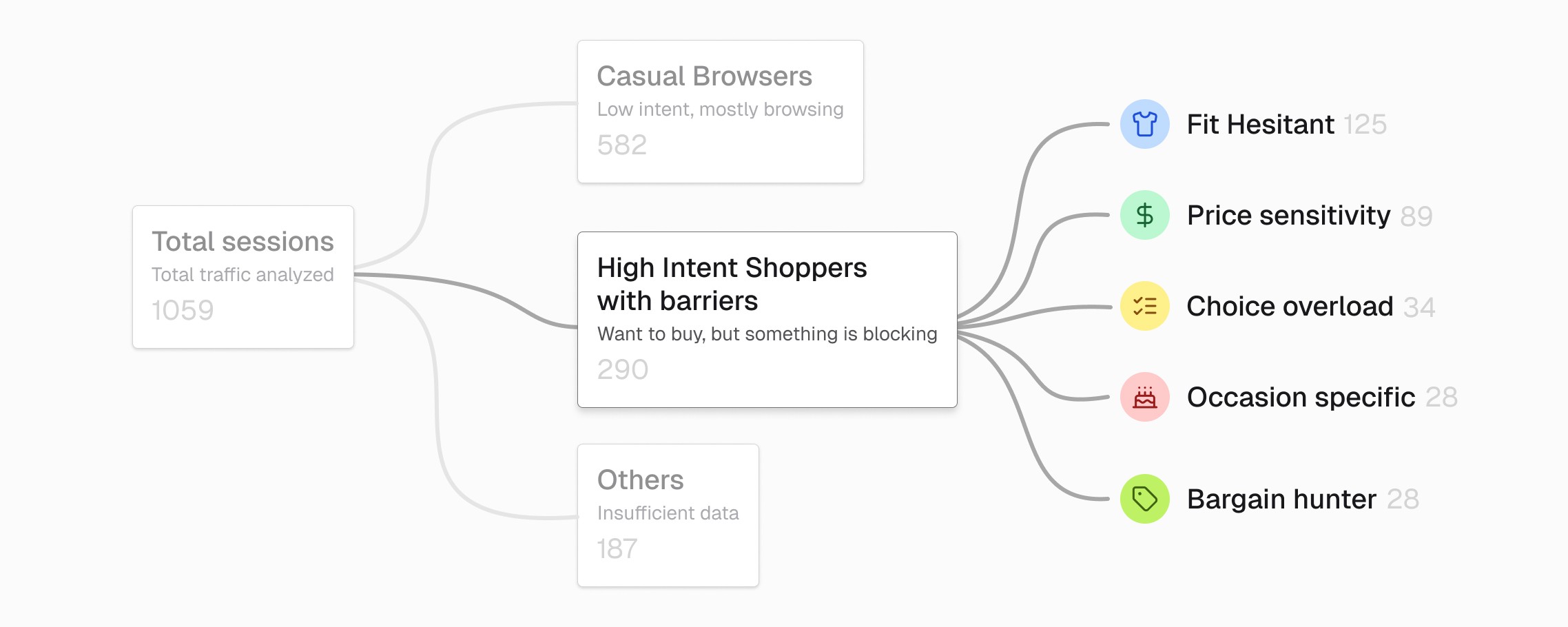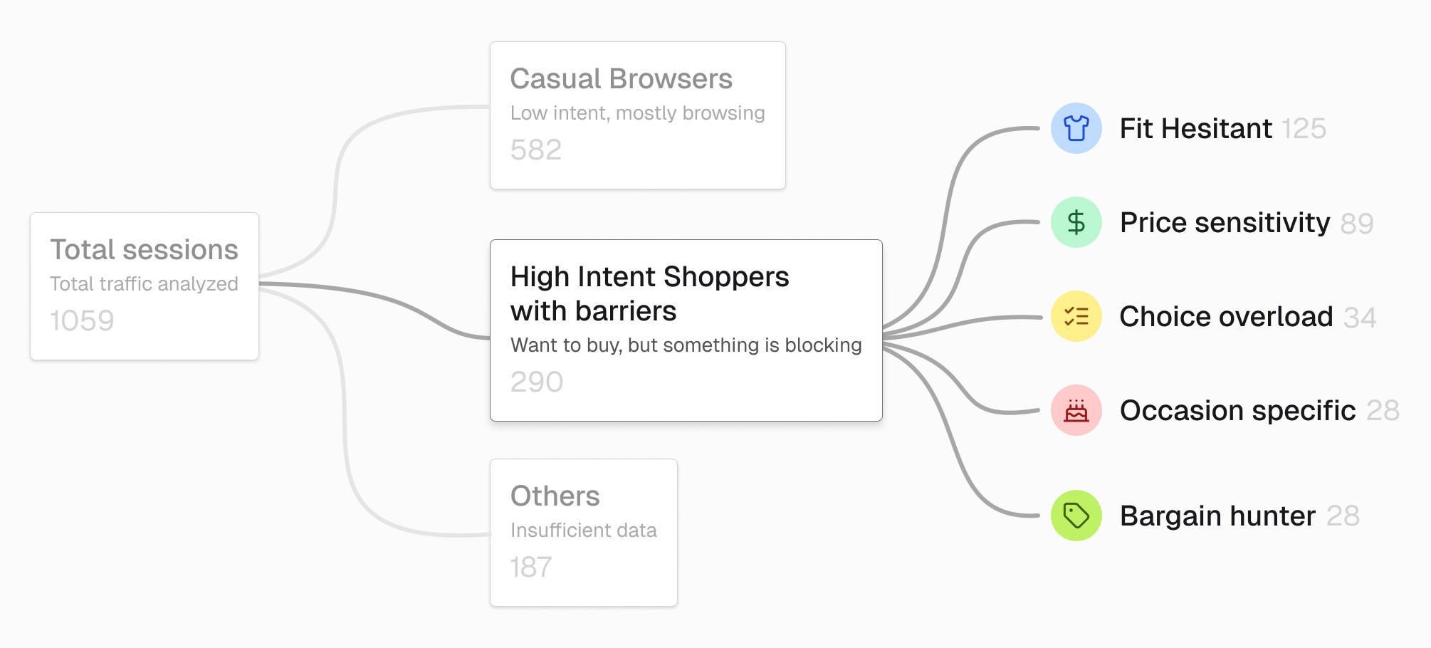 It continuously interprets in-session behavior, explains why a shopper is hesitating, and only then considers relevant interventions.