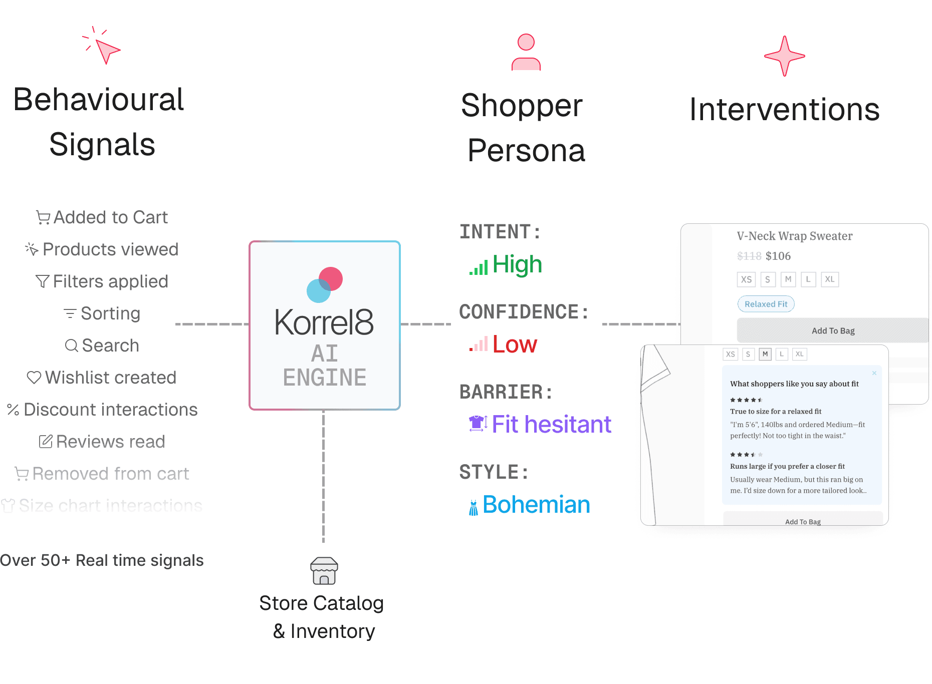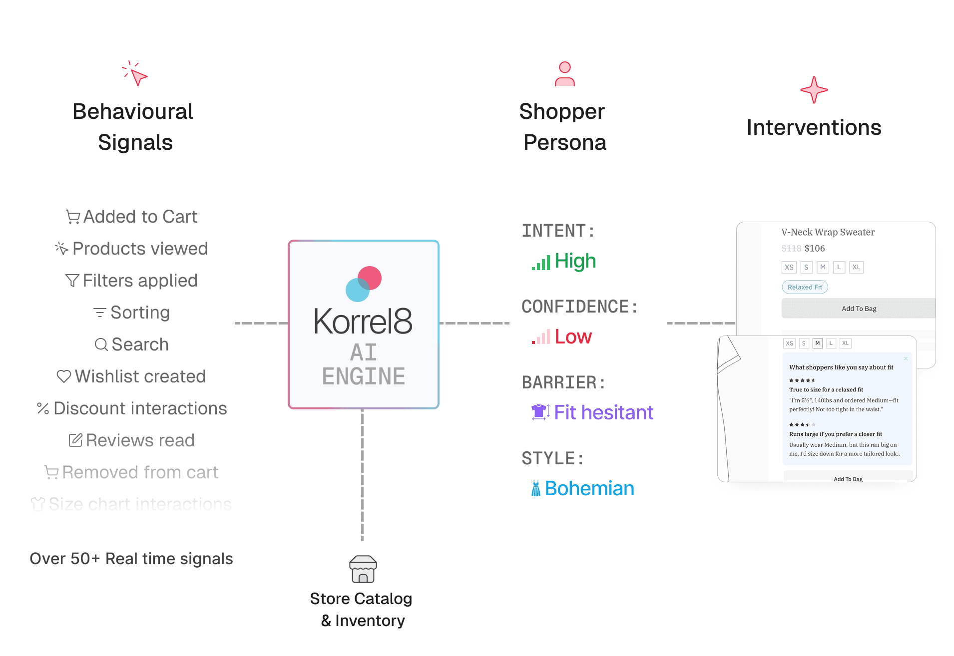 Korrel8 interprets live shopper behavior to understand intent, confidence, and blockers, then introduces small, targeted nudges to help shoppers move forward